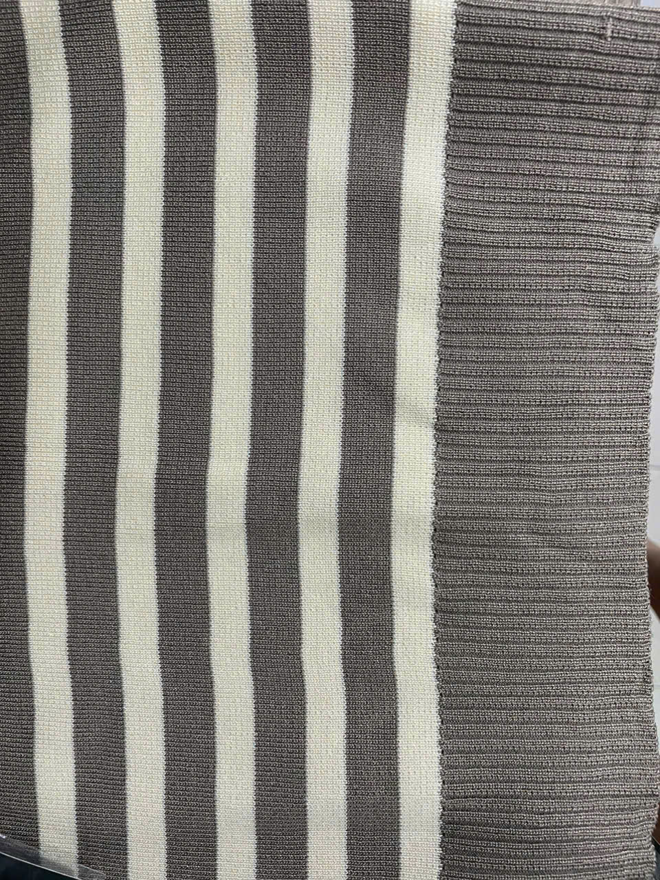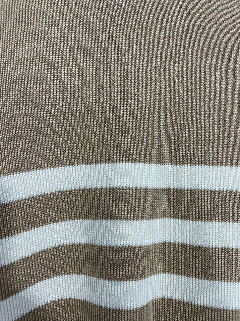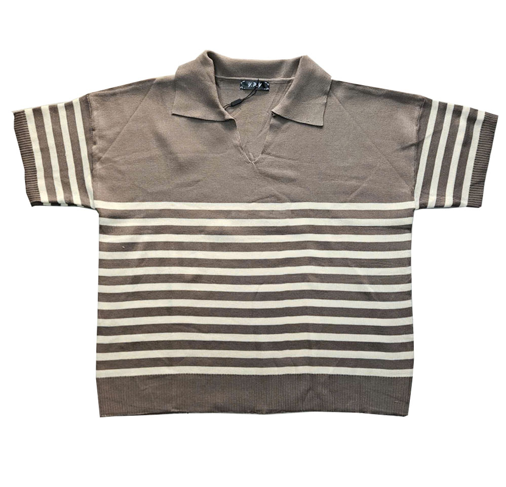 Chất len mongtoghi của Thái nè chị em ơi , co giãn thoải mái luôn nha chị em mình . Áo cổ sơ mi , xẻ tim , tay ngắn , có bo thân áo . Sọc trắng phối trẻ trung cùng màu nâu nhạt kem sậm . Áo có size cho nàng ngang ngực 68 cm và eo 70cm. Giá 270k