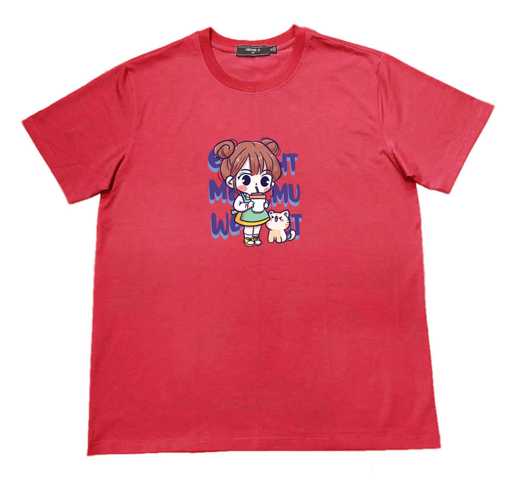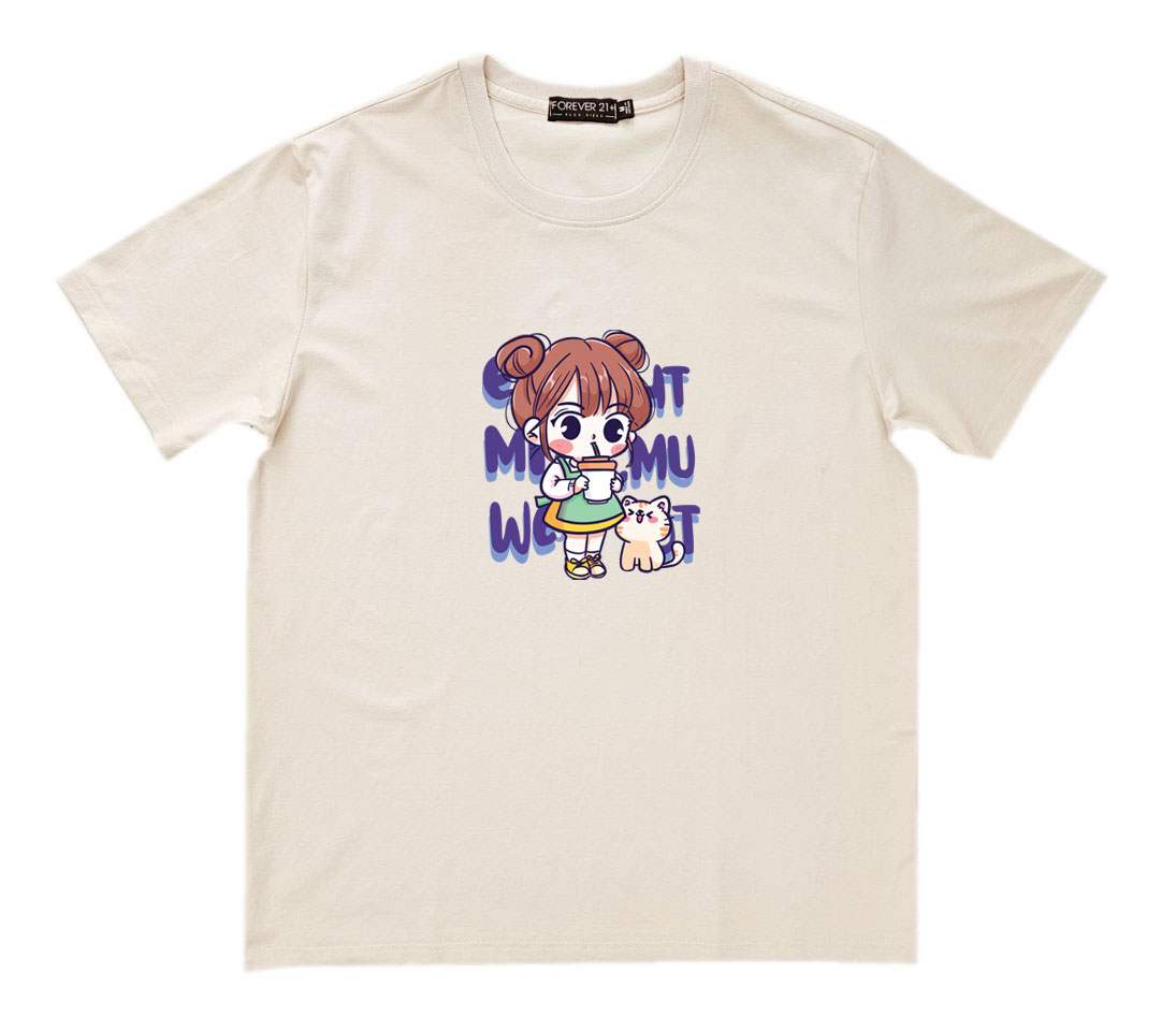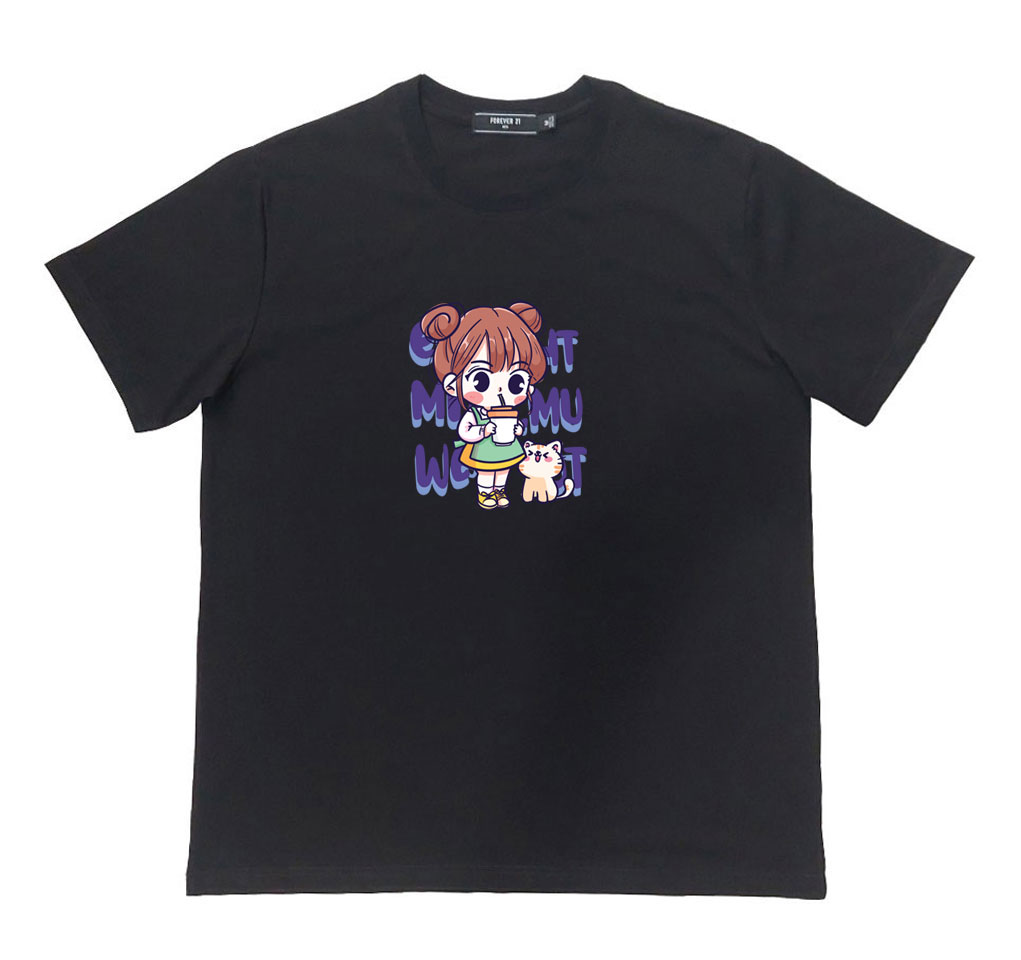 Áo thun cổ tròn thun cotton cao cấp in hình cô bé với chú mèo nhỏ