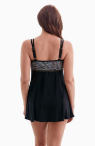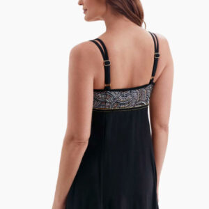 Họa tiết xanh, tím có ánh vàng thêm phần thun vàng cao cấp dưới chân ngực là điểm nhấn nà . Hoàn toàn che mất bụng và đùi với chiếc váy đen phía dưới và yên tâm với bộ lót bên trong .