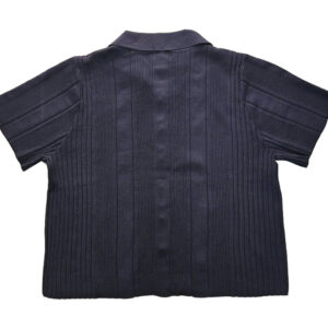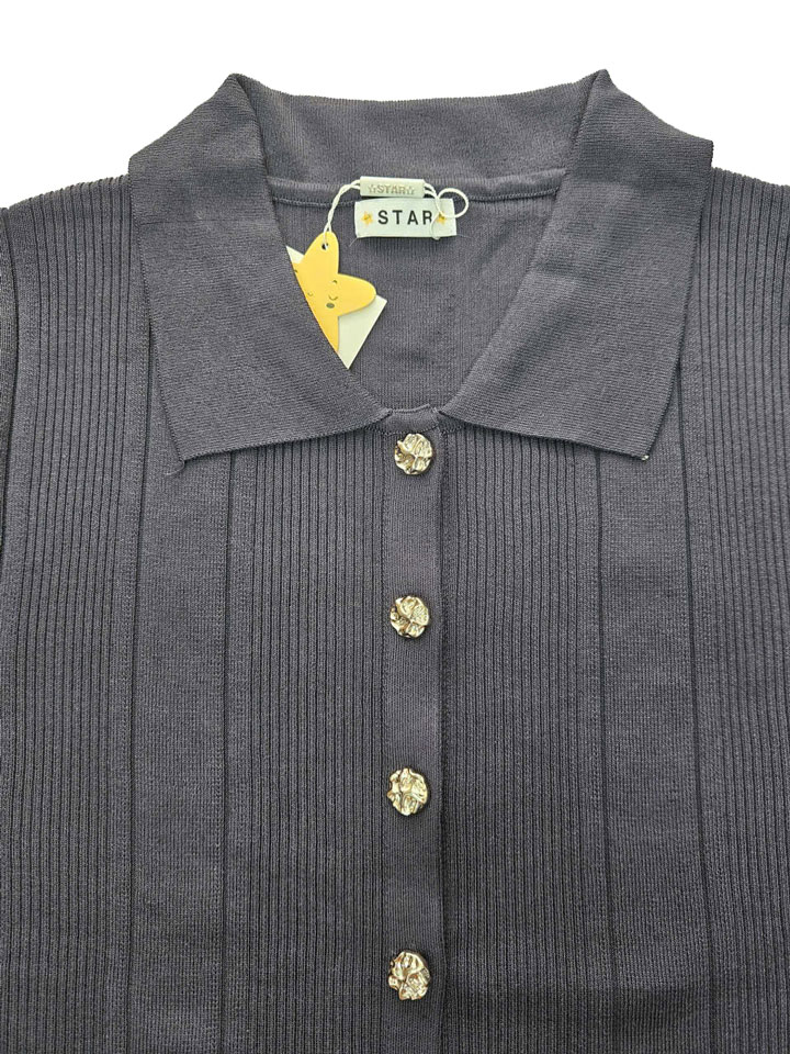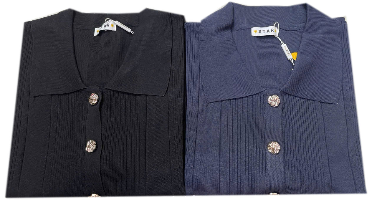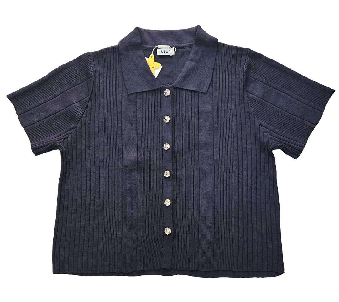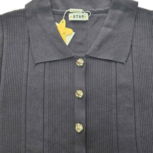 Chất len thừng dày dặn , to nhỏ phối cùng nhau , co giãn thoải mái . Áo cổ sơ mi , tay ngắn, phom A . Điểm nhấn là chiếc nút vàng . Áo có màu xanh đen . Áo có size cho nàng ngang ngực 68 cm và eo 70cm. Giá 270k