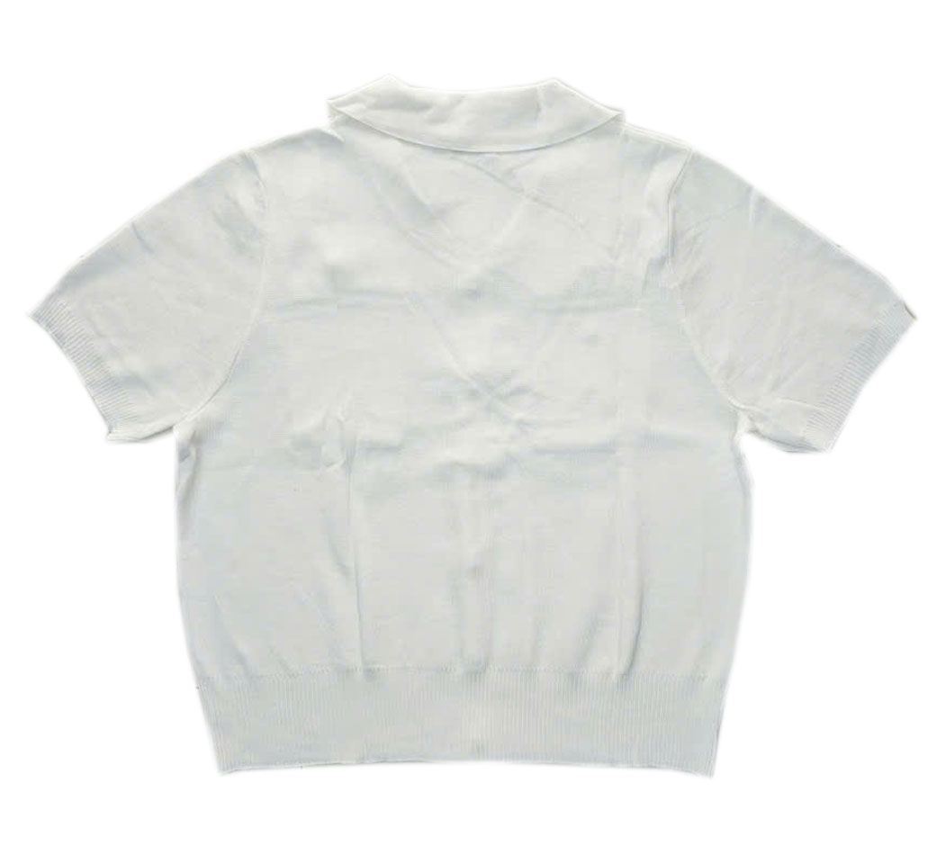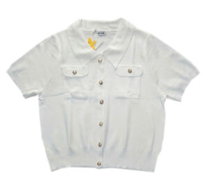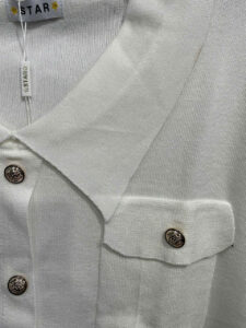 Chất len mongtoghi mịn của Thái nè chị em ơi. Áo cổ sơ mi , tay ngắn , có bo thân áo . Điểm nhấn là hai chiếc túi cùng bộ nút vàng sang .Áo có màu trắng phối nút vàng cực sang. Áo có size cho nàng ngang ngực 68 cm và eo 70cm. Giá 270k